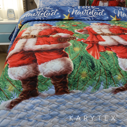 Edredón Navidad SANTA CLAUS doble faz con unicolor AZUL. Incluye funda(s) de almohadones decorativos
